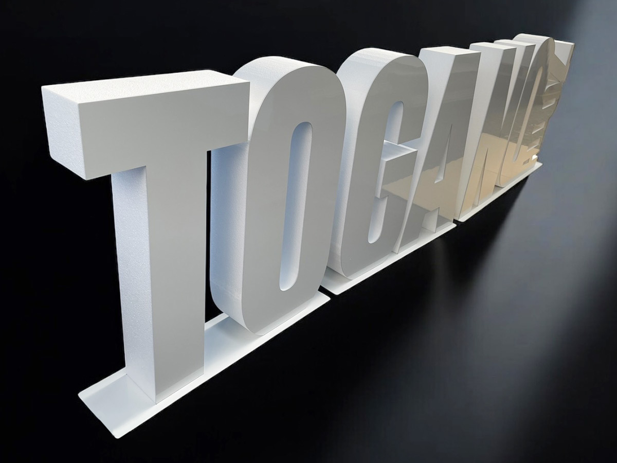 【発泡スチロール切り文字】全面塗装ありの社名デザイン切り文字看板の製作事例をご紹介します。