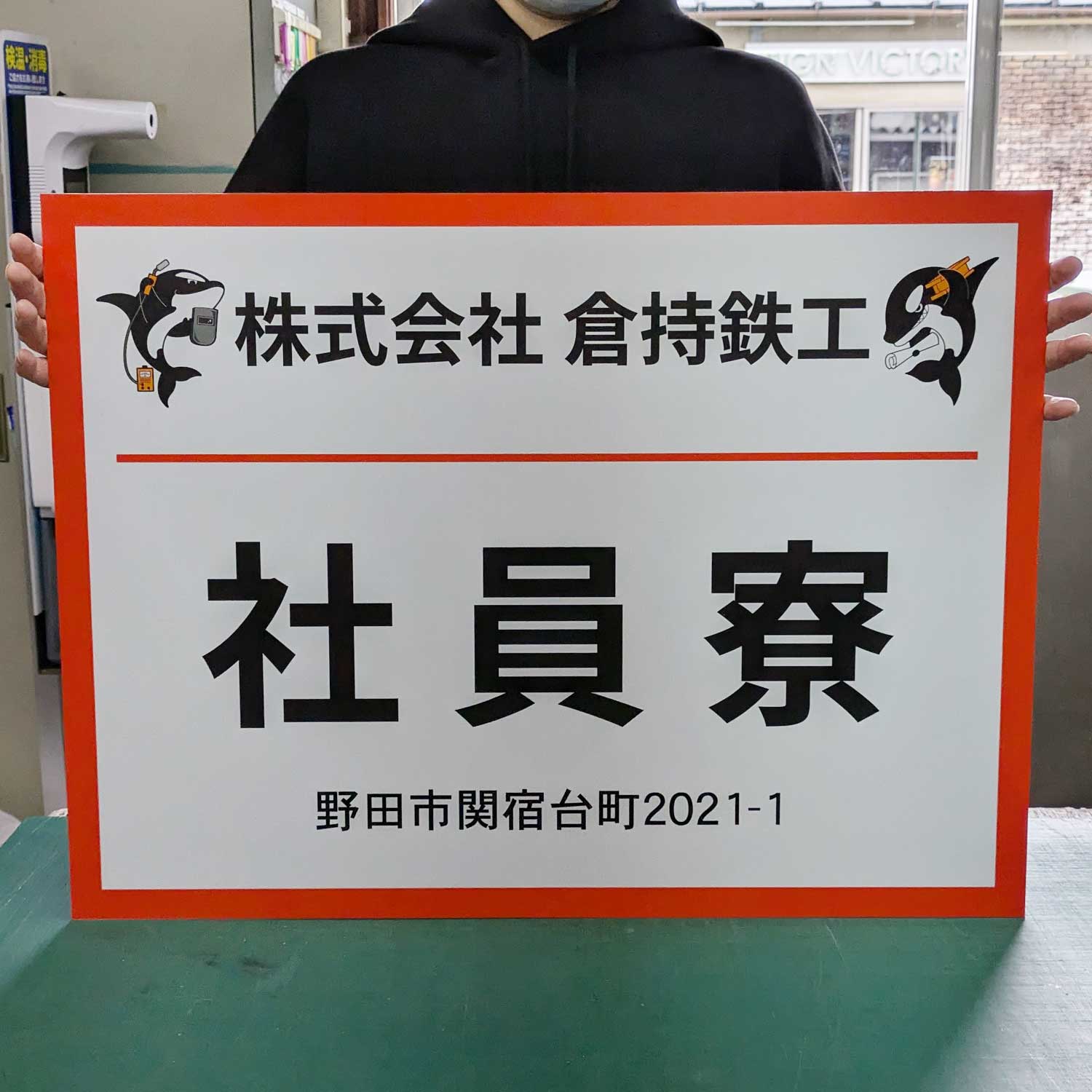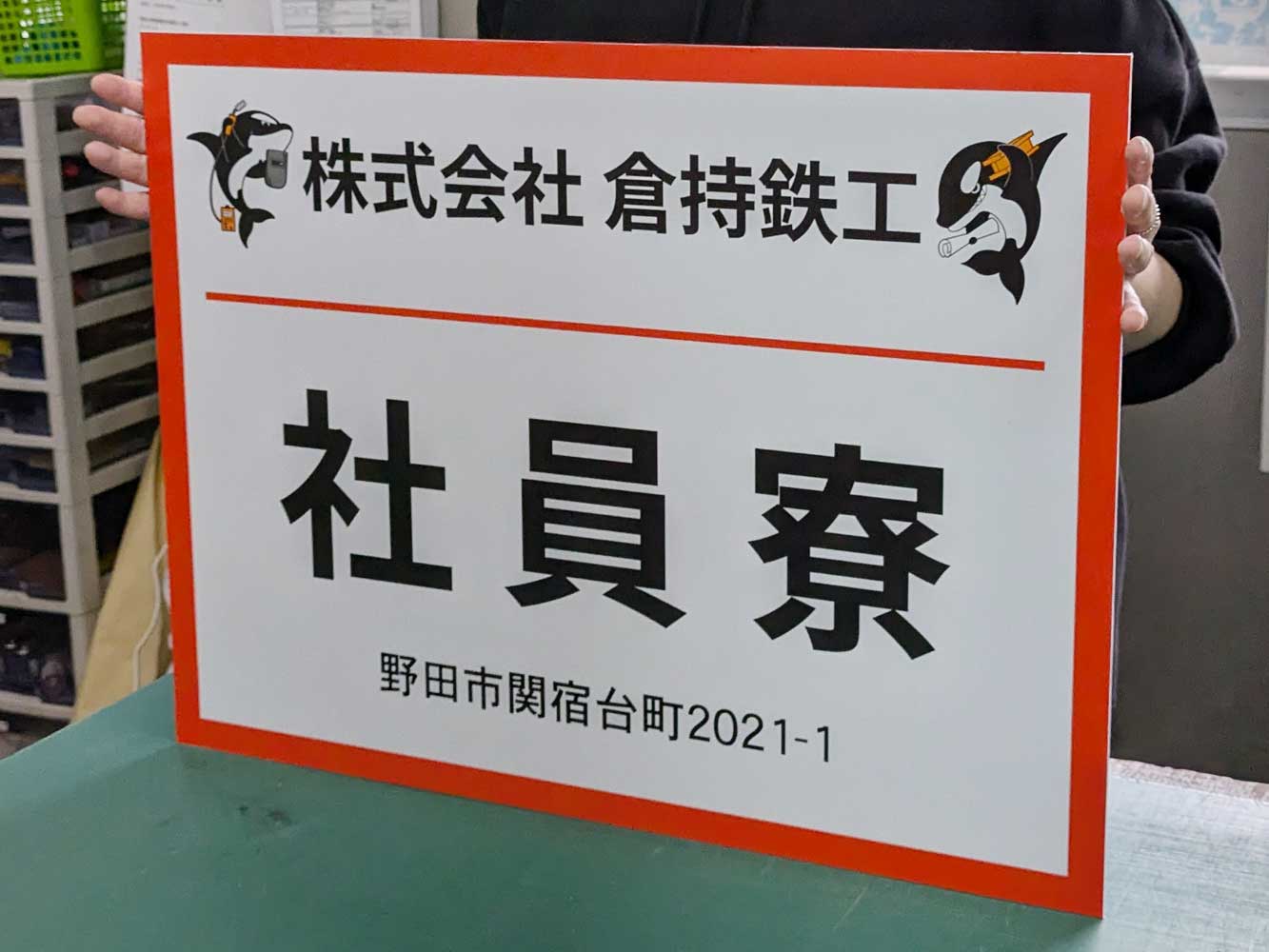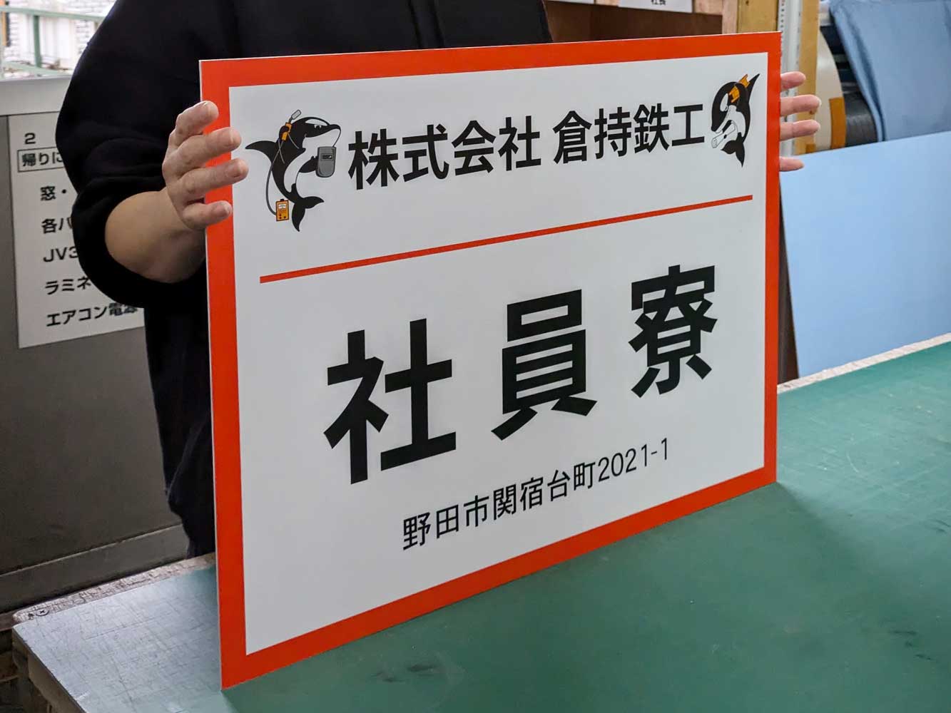 今回は会社のキャラクターをデザインした社員寮のプレート看板を導入していただきました。
