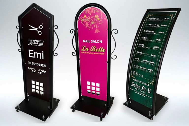 街中でよく見かける置き型看板、A型看板の制作事例をご紹介いたします。シンプルなスタンド看板、立て看板とも言われる製品は、折りたたみができて収納が簡単・軽量なので、お店の前に置いたり、案内や告知にご利用いただいたりと様々なシーンでお役立ち…