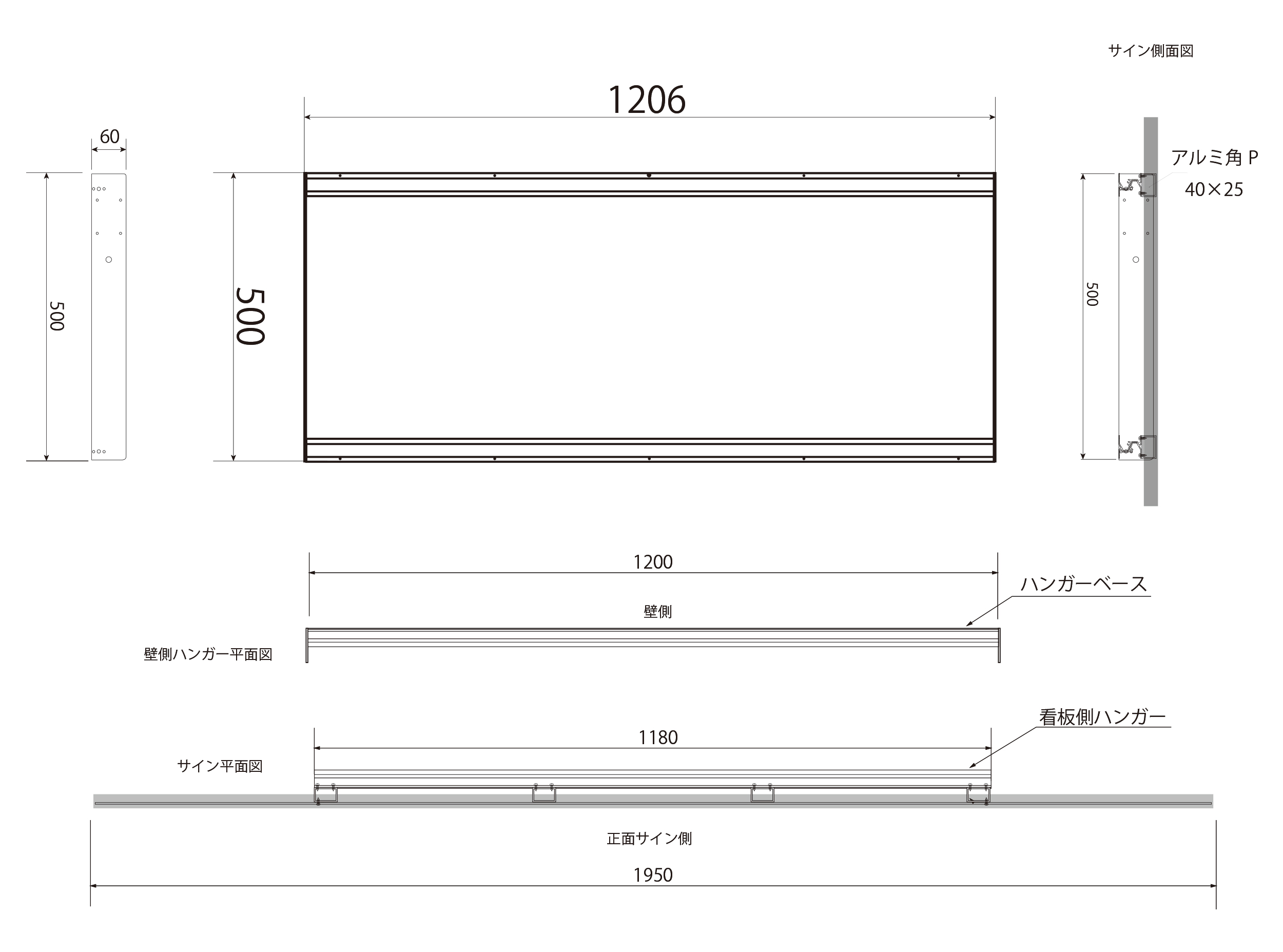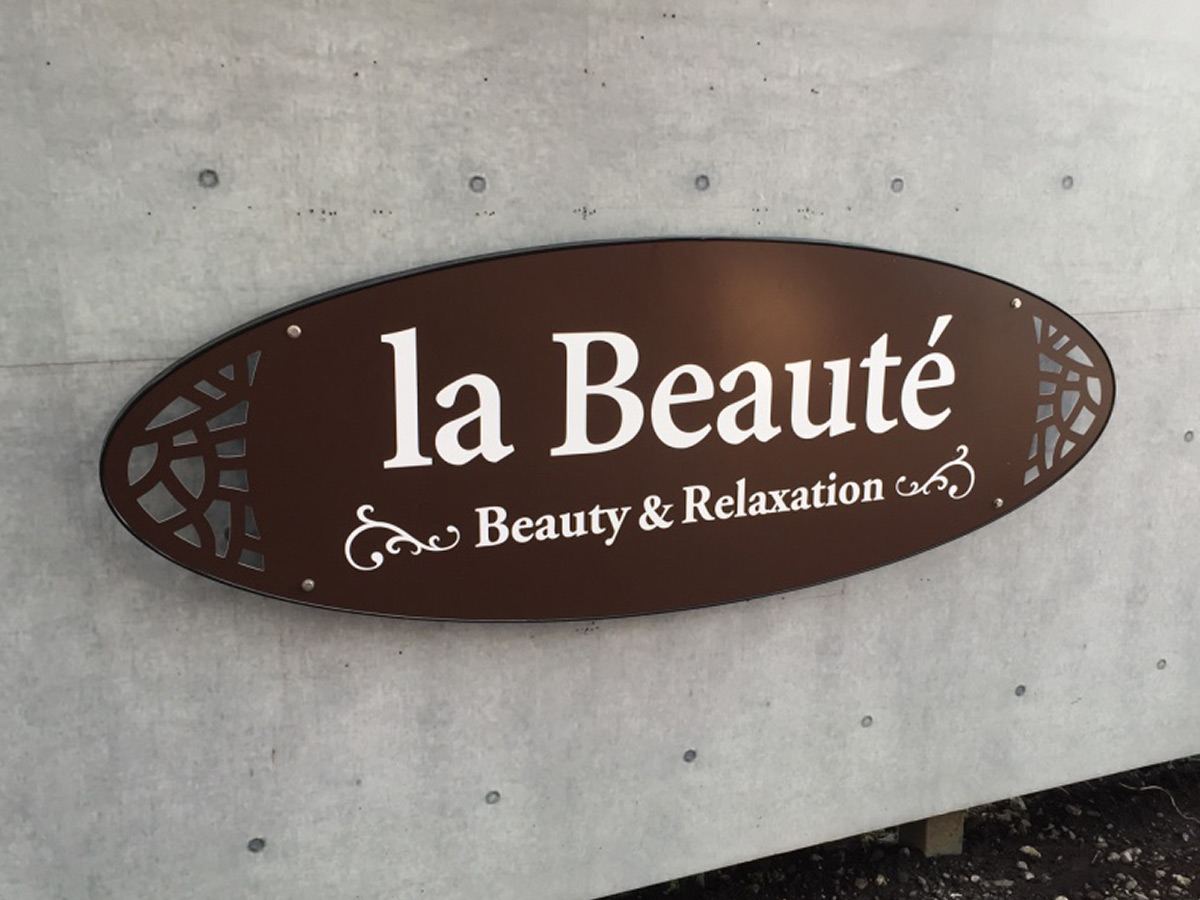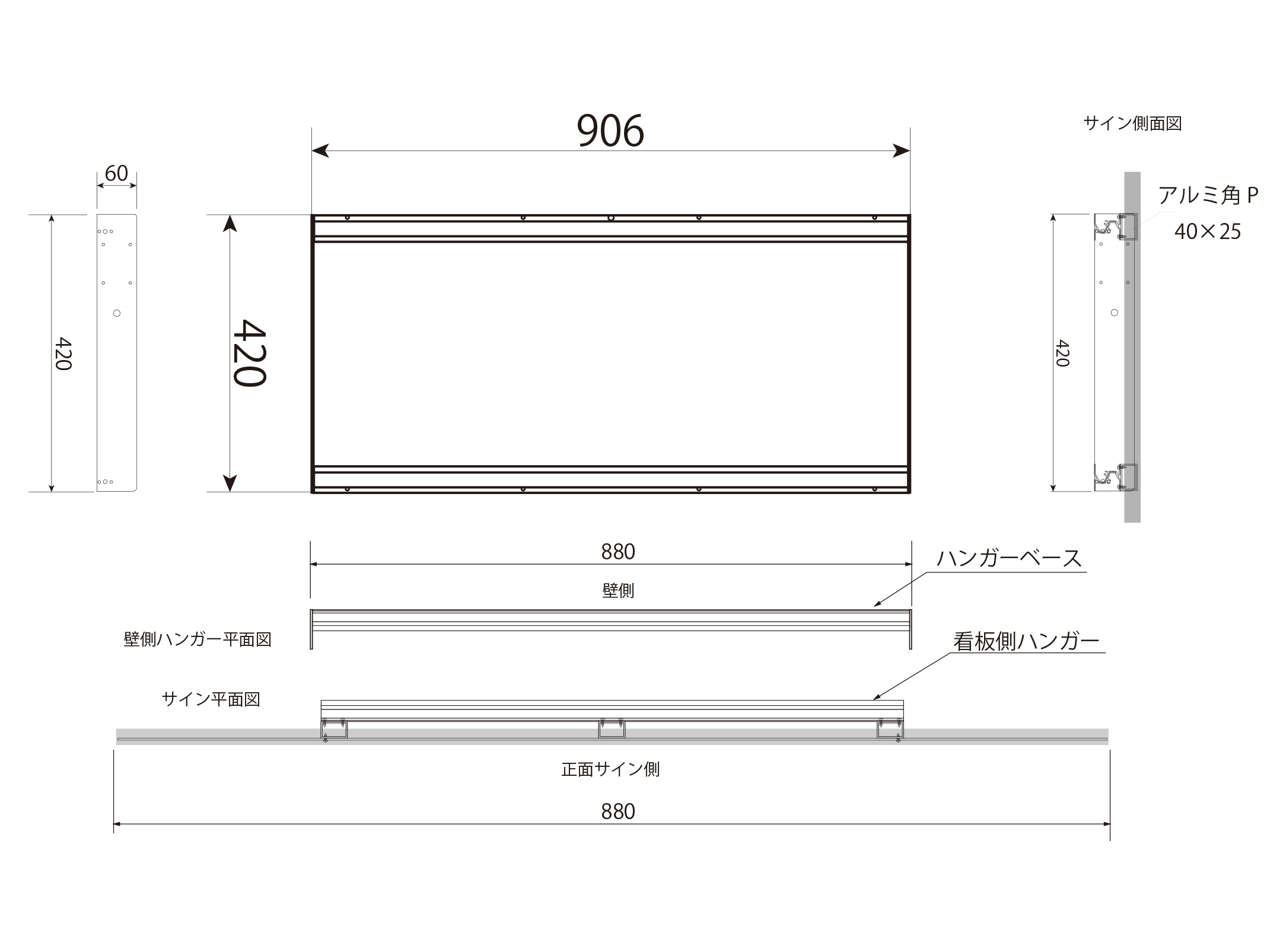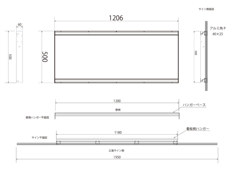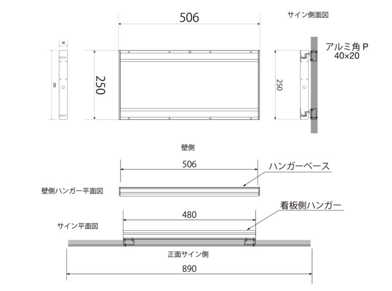 シンプルサイン イージー 2025年10月7日 by admin_simple シンプルサインイージー SSサイズ ¥43,100(税別/送料別)~ 切り抜き加工がおしゃれ ローコスト軽量な屋外用壁面看板 軽量で耐候性のあるアルミ複合板に屋外用UVカットラミネート加工のデザインプリント張り。おしゃれなフレーム形状と柔軟なデザイン性で、ローコストでもオリジナルのデザイン看板が製作できます。 シンプルサイン イージーの特徴 製作・施工事例 お客様の声 テンプレートデザインについて お見積り・お問い合わせ PRODUCT FEATURES OF SIMPLE SIGN EASYシンプルサイン イージーの特徴 ローコスト軽量で女性でも持てる重量感 設置工事もローコストに サイン業界でも一般的に利用されている屋外用平看板の材料「アルミ複合板」を板面に使用し、非常に軽量な仕上がり。表面はUVカットラミネート加工の看板用大型インクジェットプリンタで印刷、高解像度で複雑なデザインでも再現。サイズやフレームの種類が変わっても、すべて軽量な仕上がりとなりオシャレでオリジナル性の高い看板を最低限の職人様で設置でき工事費用もローコストに抑えることができます。 シンプルサインルミネスの取付 背面のパワーLED 側面に25mmの樹脂製 額縁を巻付け。看板に厚みが生まれ重厚感を演出 軽量さの秘訣、看板の材料「アルミ複合板」は厚み3mmと薄型ですが、側面に樹脂製25mm幅の額縁を巻きつけることで、看板の厚みを演出。平看板ではできない、壁から浮き出るような立体感で一味違う高級感や重厚感が出ます。 独自の取り付け方式「アルミハンガー」で 設置工事の人員や工数を最小限に シンプルサインは、独自の看板取り付け方式「アルミハンガー式」を採用しております。壁面に取り付ける「ハンガーベース」を先に壁に設置し、看板の裏側にある対となるアルミハンガーのフックをハンガーベス引っ掛け、フック下からビス留めするだけで設置は完了。大きいサイズでもクレーンの引き上げなどは不要で、位置決めも固定も最小限の工数・人員で行えます。 プレート看板にはない厚みを演出 樹脂製額縁の巻付け EPSON製 大判プリンタと国産塩ビシート・UVカットラミネート加工で 高いクオリティと高耐候性を実現 看板表面のデザイン出力には、超高画質・広色域と鮮やかな色彩表現のEPSON製 サイン&ディスプレイ向け大判インクジェットプリンタを使用。高精度で発色も良く、複雑なデザインデータも再現出来ます。印刷に用いる塩ビシート、及びラミネート加工用シートは、国産かつ屋外耐候性が高い製品を選定し、非常に高いUVカット率で紫外線によるインクの色あせを抑え長期間デザインの美しさを保ちます。 屋外耐候性塩ビシート 協同制作(国産品) 紫外線カット機能付きラミネート ビッグテクノス(国産品) カラー出力機 エプソン(SureColor S80650使用) STRUCTURE OF SIMPLE SIGN EASYシンプルサイン イージーの構造 01シンプルサイン イージーの基本的な構造について 看板 盤面の構造について シンプルサインイージーは、看板面のベース材料となる「アルミ複合板」に、屋外耐候性・UVカットラミネート加工を行ったインクジェットプリントシートを貼り付けカラーやデザイン柄を貼り付け。外周には樹脂製の額縁を巻き付けることで看板に厚みを与えております。価格を最小限に抑えた設計と柔軟なデザイン性、かつ厚みをもたせた重厚感・高級感が両立するローコスト屋外壁面看板です。 ハンガーベースについて シンプルサイン イージーは取り付けに関しても他社製の看板製品に比べ簡単に行える設計。壁面に対して看板の板面より先に看板を引っ掛けるための「ハンガーベース」を設置し、ハンガーベース上下のフックに対して板面の背面にあるハンガーを引っ掛ける様な設置方法となります。看板全体を持ち上げて位置決めをする必要がなく、大きなサイズになってもハンガーベースで位置決めを行えるので設置時の工程を大きく抑えることができます。 アルミハンガーと壁面取付けイメージ 上記図は、アルミハンガー・ベースハンガーによる取り付けイメージ図です。壁面に先にハンガーベースを取り付けた後に、看板背面のアルミハンガーを引っ掛けるように設置します。位置決め用のペンだし原稿を使用する際は、ハンガーベースのみ正確に行えば良いため非常に簡単です。板面は先述の通り非常に軽量なため、ハンガーとハンガーベースの固定は、下側からビスで一本留めるだけで固定が完了します。 02サイズ別 各スタイル共通の寸法図 イージー オーバルスタイル オーバルSS W890 × H350 × D65(mm) オーバルM W1500 × H590 × D70(mm) オーバルL W1950 × H680 × D70(mm) イージー ウェーブスタイル ウェーブSS W890 × H350 × D65(mm) ウェーブM W1500 × H590 × D70(mm) ウェーブL W1950 × H680 × D70(mm) イージー スプレッドスタイル スプレッドSS W890 × H350 × D65(mm) スプレッドM W1500 × H590 × D70(mm) スプレッドL W1950 × H680 × D70(mm) 03サイズ別 取り付け用アルミハンガーの寸法図 SSサイズ 板面サイズW89